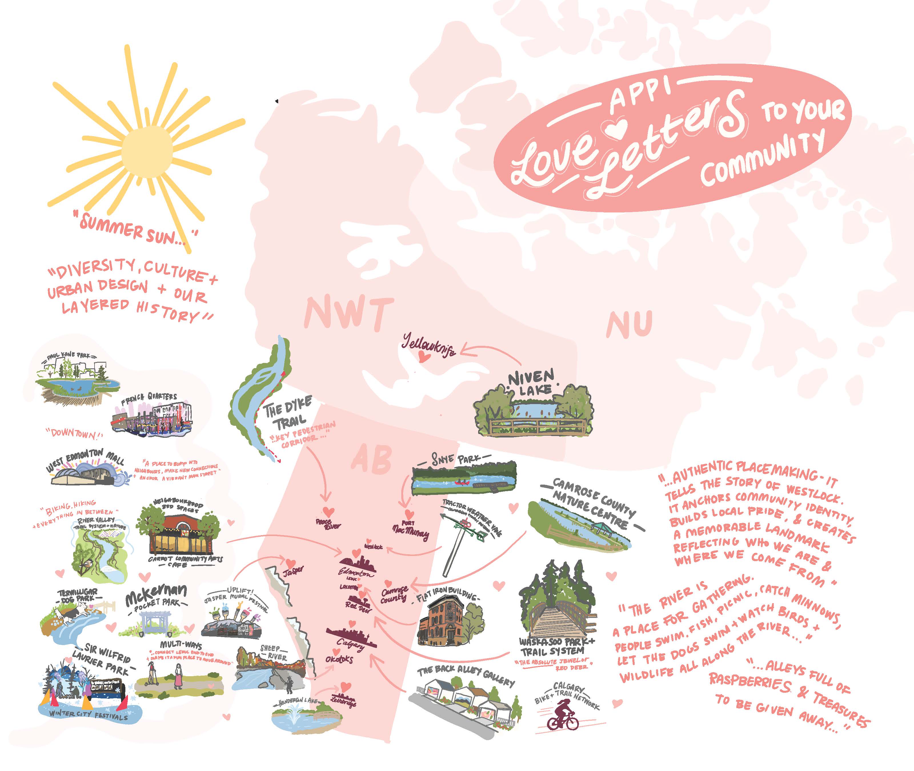 Thank you to everyone who shared a place or space they love in their community. From river valleys and trail networks to public art, heritage buildings and beloved “third places,” your responses celebrate the everyday spaces that connect us across Alberta, the Northwest Territories, and Nunavut.